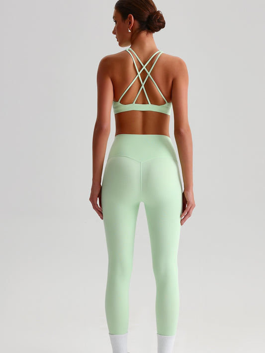 “This Cool-air spaghetti straps cross back yoga bra with leggings is so soft when I wear it in the nature to do yoga trainning."